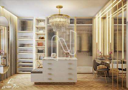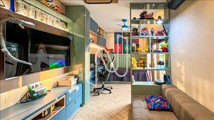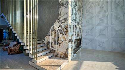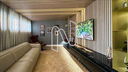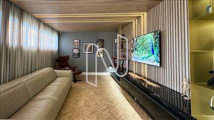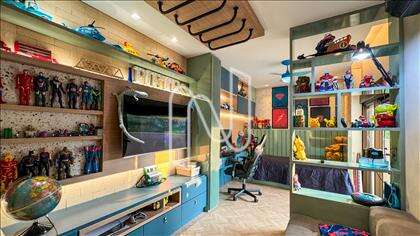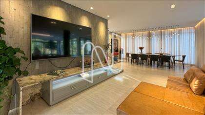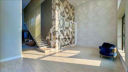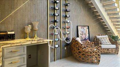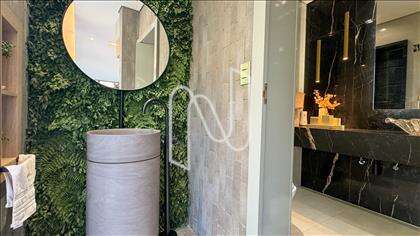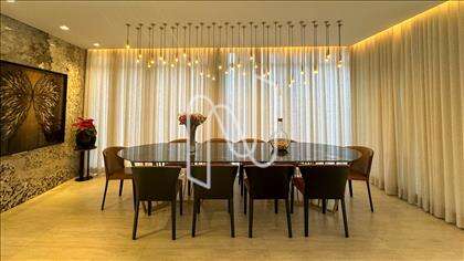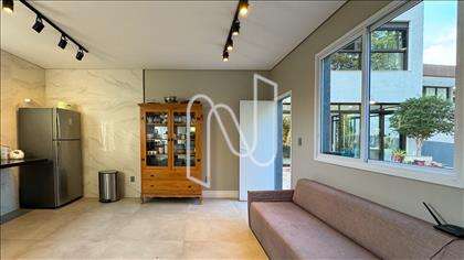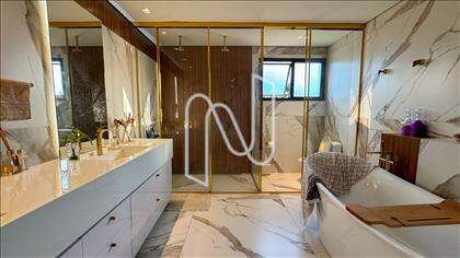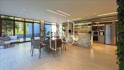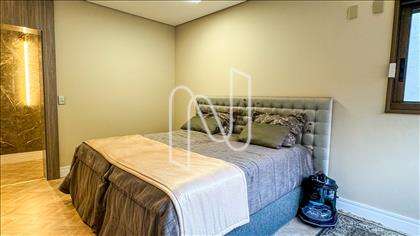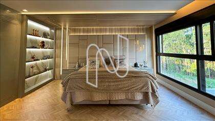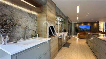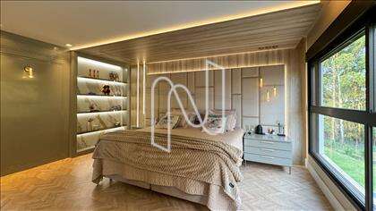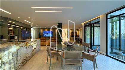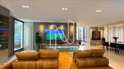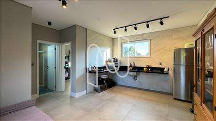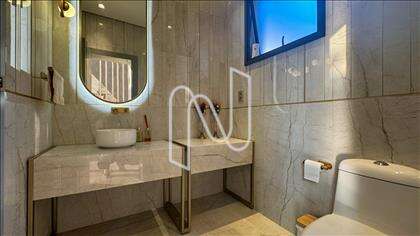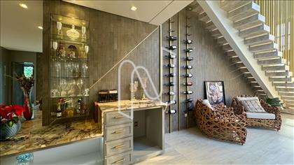 Casa de 4 quartos sendo 2 suítes e 2 semi-suítes com acabamento diferenciado, ao lado da portaria e fundo para a mata. Ampla sala com pé direito duplo, lareira retroiluminada em pedra natural (Quartzito White Patagônia) do chão ao teto. Salas de jantar, de TV e Cozinha integradas com Adega e Cristaleira em vidro. Todos os ambientes com acabamento no mesmo Quartzito e marcenaria impecável. Móveis com acabamento laqueado, iluminação planejada em led, bancada da cozinha com calha úmida em Corian. Área Gourmet com churrasqueira e pia em Corian. Belíssimo Lavabo interno com acabamento em filetes dourados e externo para atender a área de lazer. Ampla despensa, louceiro e área de serviço. Casa de Hóspedes (Edícula) com2 quartos, banho, cozinha e sala integrada. Estar íntimo no segundo pavimento e Night Kitchen.