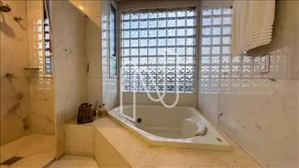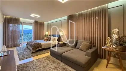 Suíte master ampla com closet, hidromassagem, varanda com vista para a Lagoa dos Ingleses e acabamento refinado;