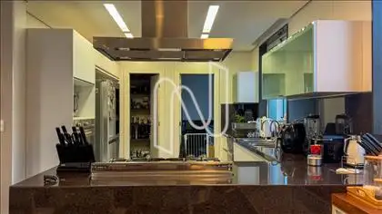 Cozinha planejada com armários e bancadas em granito Café Imperial, integrada ao espaço gourmet;